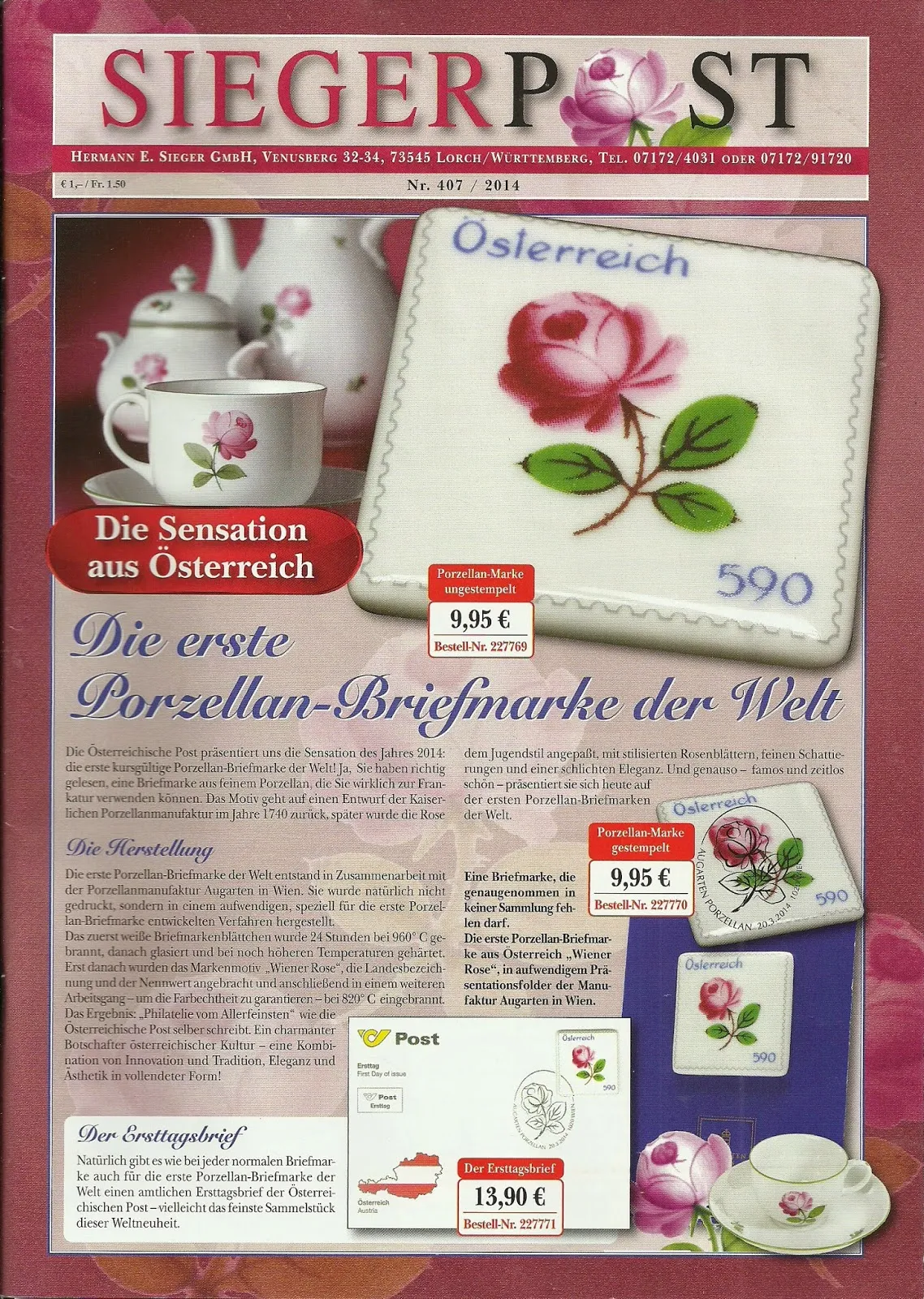 Outra publicação que temos recebido regularmente, é a «Sieger Post», e este é o nº 407, da casa filatélica da Alemanha Hermann E. Sieger , de Lorch/Württemberg. Também esta lista de preços apresenta milhares de selos e moedas de todo o mundo, secções especializadas nas novidades mundiais e acessórios para o coleccionismo. O grande destaque é para toda a filatelia da Alemanha, todos os períodos anteriores à guerra, Alemanha Federal, República Democrática Alemã, peças raras e blocos. Na capa apresentam uma das últimas novidades dos Correios da Áustria.