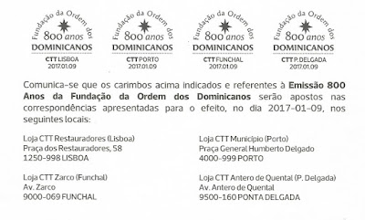 Já temos mais novidades da marcofilia portuguesa para os próximos dias, criadas pelos CTT - Correios de Portugal para a emissão filatélica que será posta a circular no dia 9, segunda-feira, comemorativa dos «800 Anos da Fundação da Ordem dos Dominicanos». São os habituais quatro carimbos de primeiro dia de Lisboa, Porto, Funchal e Ponta Delgada. Para o dia 17 haverá mais um carimbo comemorativo da «Ponte 25 de Abril - 50 Anos a Ligar Destinos», a ser aposto na Loja CTT dos Restauradores, em Lisboa.