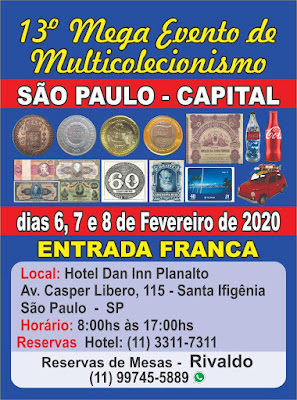 O movimento coleccionista está a mexer um pouco por todo o mundo, como temos visto pelas notícias que surgem aqui, e os próximos dias 6 a 8 de Fevereiro vão ser de coleccionismo em São Paulo, no Brasil, com a realização no Hotel Dan Inn Planalto do "13º Mega Evento de Multicolecionismo", uma informação e imagem que chegou do amigo Paulo Ananias, da Filatelia Ananias com indicação no cartaz do contacto para mais informação.